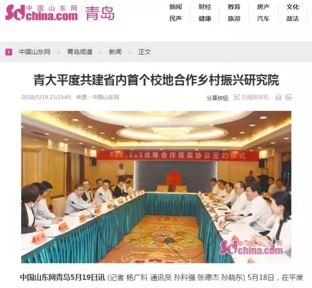 5月18日,在平度市举办的青岛大学与平度市人民政府战略合作框架协议签约仪式上,“青大——平度齐鲁乡村振兴研究院”正式成立,这也是我省首个基于校地合作的乡村振兴研究院。包括乡村振兴在内,双方此次共签署8项系列项目合作协议,涵盖科技创新和成果转化、医疗健康、基础教育、文化旅游诸多领域,以人才培养、科技合作、产业培育等深入推进落实新旧动能转换重大工程,推动乡村振兴战略实施。